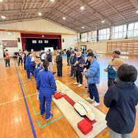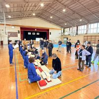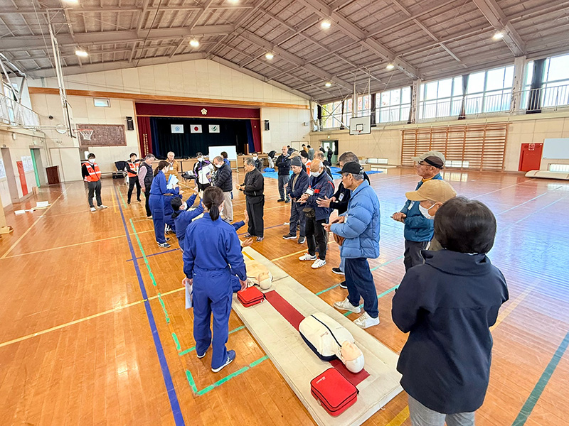 後半は消防団員のご指導の下、胸骨圧迫やAEDの使用手順を確認しながら訓練しました。