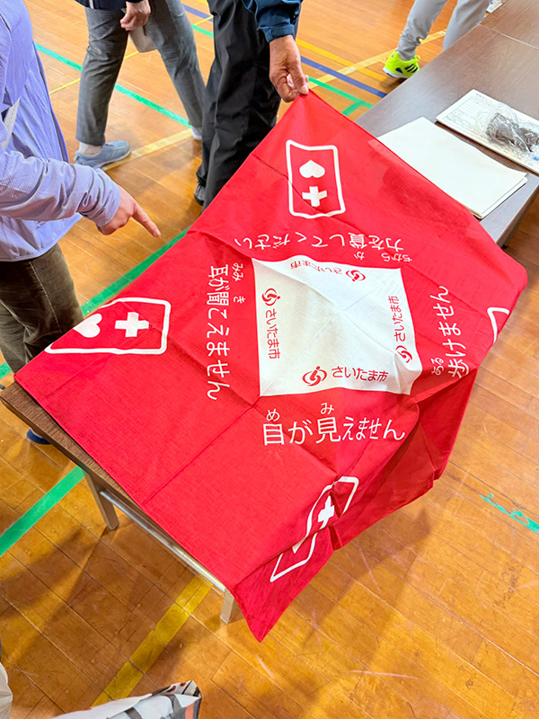 赤い災害時障害者支援用バンダナは、障害のある人が災害時に周囲に自身の障害について伝え、障害に合わせた支援を受けることができるようにするためのもので、指定避難所に配備されています。