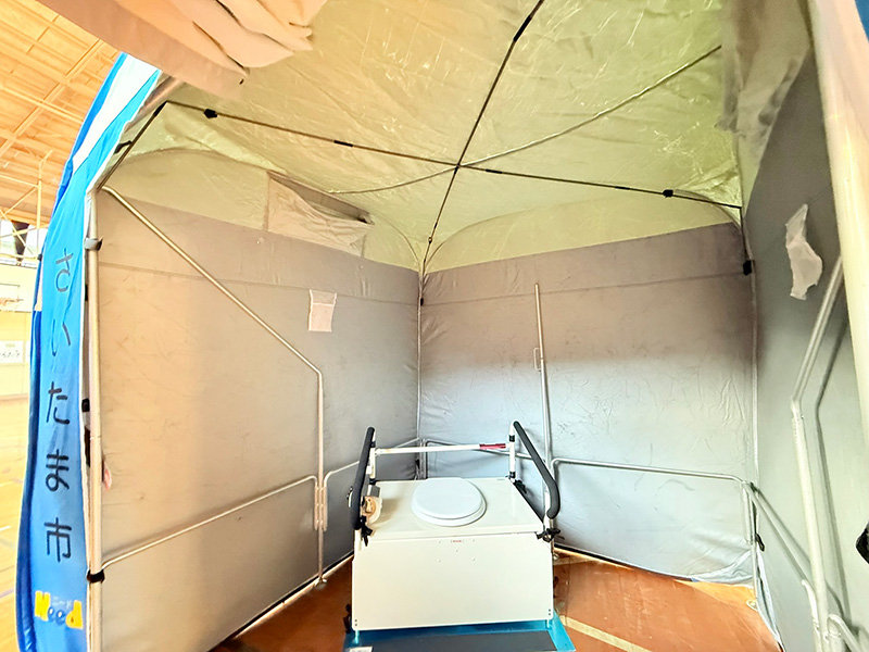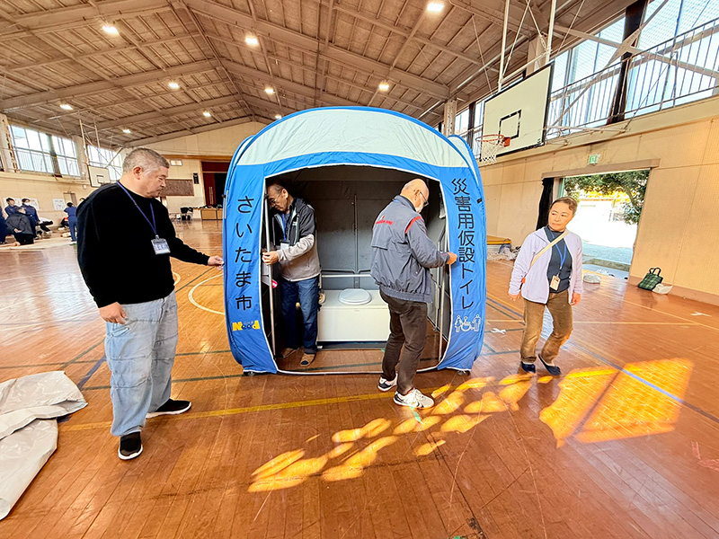 前半は総務班、情報班、環境班、救護班、物資班、食糧班に分かれた訓練を行い、東浦和七丁目自治会は環境班として仮設トイレの設置・収納訓練を中心に行いました。